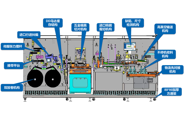 本设备主要用于方形锂离子动力电池正负极片的成形,采用五金模具裁切成形,适用于连续涂布工艺。极片卷料自动放卷纠偏,经张力控制系统,过程纠偏系统,引入到模具工位,送料机构牵引输 送极片,五金模具裁切极片成形极耳。裁断机构自动分切成片,真空皮带吸附分切后的极片输 送到料盒内,自动剔除视觉检测设备识别的不良品。