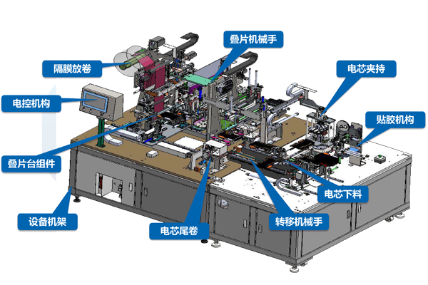隔膜:主动放卷,张力控制;隔膜纠偏;隔膜除静电;隔膜对齐精度±0.4mm。 高精度:通过极片的精确定位保证极片在叠片中整体精度达到±0.5mm 。 高效率:叠片速度可达0.8-1.2s/pcs(与极片大小有关)。 粉尘防护:料盒,预定位都有安装有效的粉尘防护装置。 多片漏片防护:漏片检测防护;防多片机构,多片检测机构,有效防止多片叠入电芯。 技术参数:
